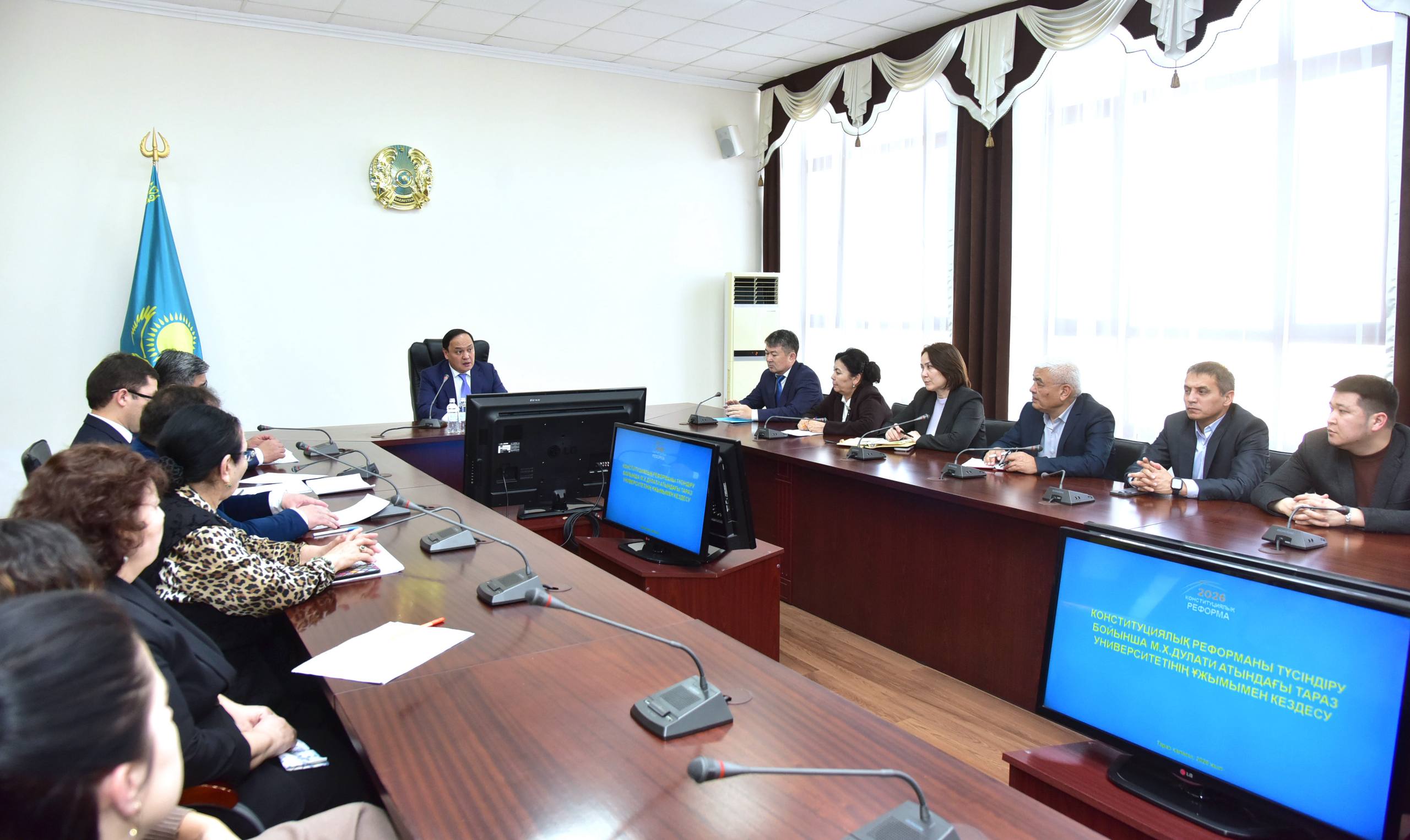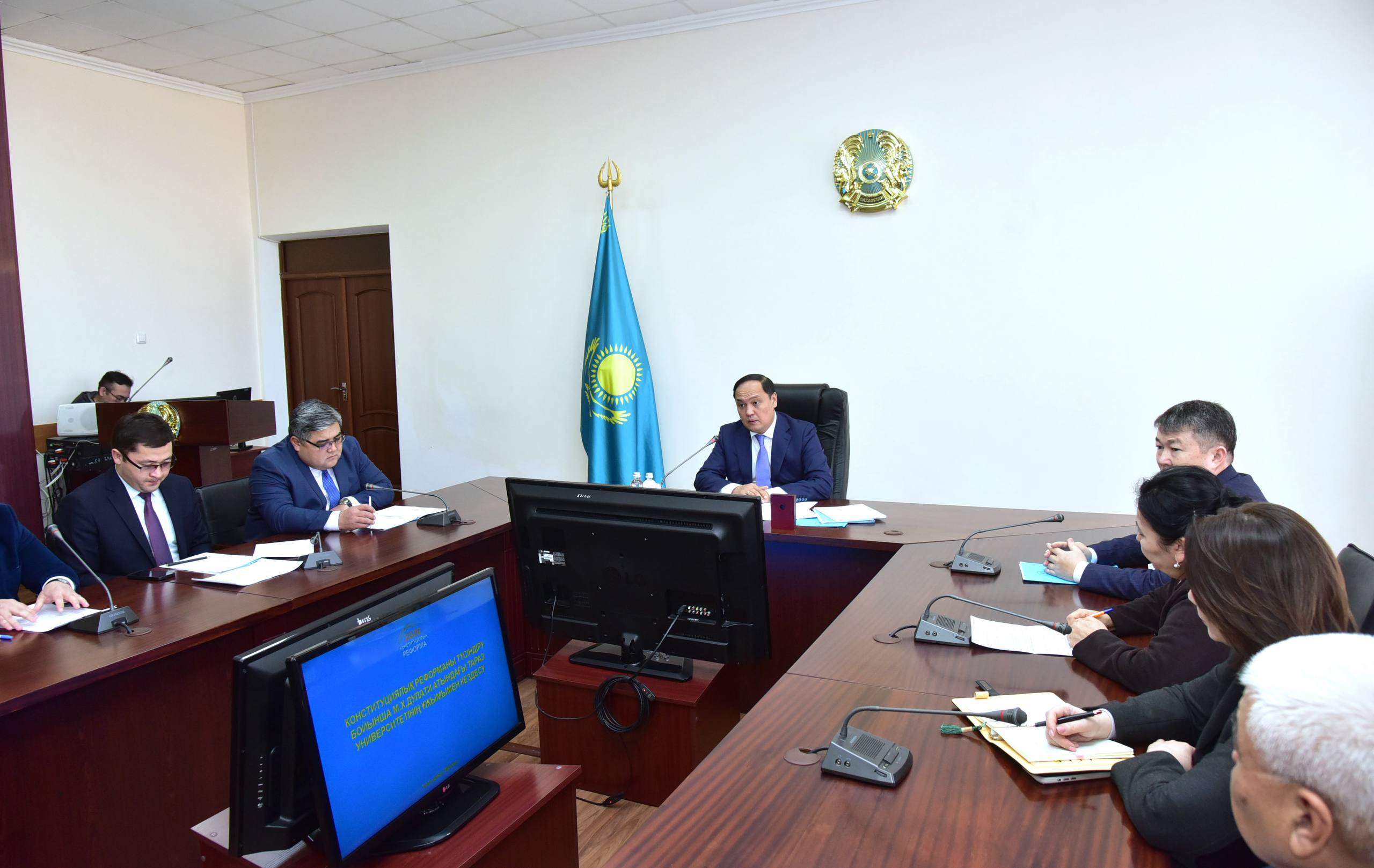 Университет қабырғасында Жамбыл облысының әкімі Ербол Қарашөкеевтың төрағалығымен профессор-оқытушылар құрамымен кездесу ұйымдастырылды.