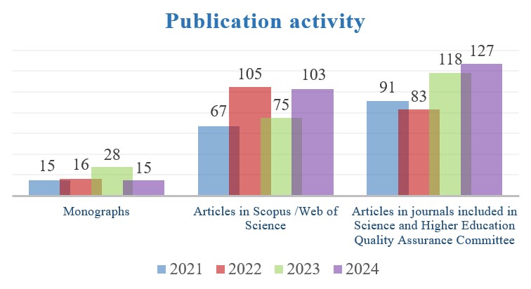 From 2016 to 2024, university scientists have prepared and published 193 monographs, including 40 in foreign scientific publications, 13265 articles and reports, including 1067 in rating journals.