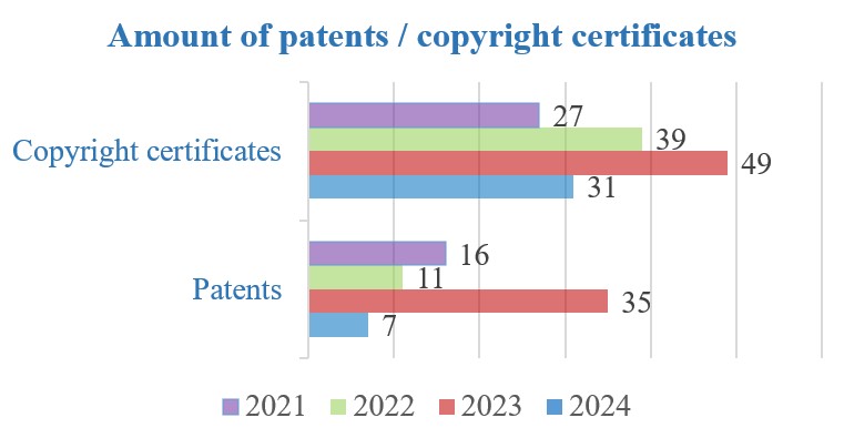 According to the results of the study, the National Institute of Intellectual Property of the Republic of Kazakhstan in 2022 issued 11 patents and copyright certificates for 39 inventions to the scientists of the University. In 2023, 35 patents and 49 certificates of authorship. In 2023, 7 patents and 31 certificates of authorship. In general, the patent base of the University since 1998 includes more than 850 protection documents.
