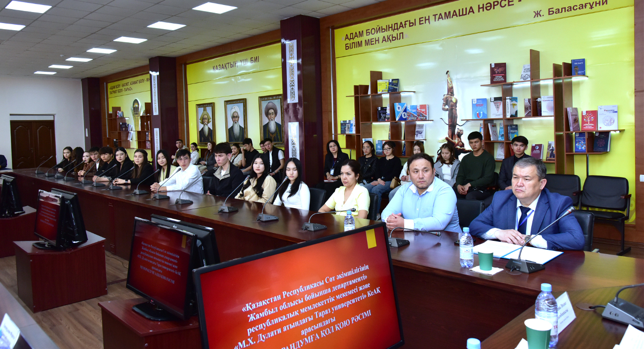 Басқарма Төрағасы – Ректор Ләззат Еркінбаева құттықтау сөз алып, бүгінгі таңда білім беру жүйесі мен практикалық саланың өзара тығыз байланыста жұмыс істеуі аса маңызды екенін атап өтті. Ректордың айтуынша, студенттердің теориялық білімін тәжірибемен ұштастыру – сапалы кадр даярлаудың басты шарттарының бірі. Осы тұрғыда сот органдарымен орнатылған әріптестік университет үшін үлкен мүмкіндік екенін жеткізді. Ал, Қазақстан Республикасы Сот әкімшілігінің Жамбыл облысы бойынша Департамент басшысы Азиз Әлиев меморандумның құқық саласындағы кадрлық әлеуетті арттырудағы маңыздылығына тоқталды. Ол сот жүйесі мен жоғары оқу орындары арасындағы тығыз байланыс жас мамандарды даярлауда жаңа мүмкіндіктер ашатынын, студенттердің өндірістік тәжірибеден өтуіне және нақты істермен танысуына жол ашатынын атап өтті.