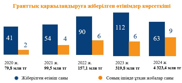 2024 жылы гранттық қаржыландыру конкурстарына 63 өтінім берілді. Егер салыстартын болсақ 2023 жылы осындай конкурстарға 112 өтінім берілді. Ал 2022 бар болғаны 90 өтінім. Гранттық қаржыландыру бойынша 63 жобаның 9 жобасы ұтты.