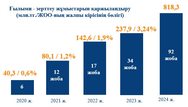 2024 жылы ҒЗЖ-ны нақты жалпы қаржыландыру 818 300 мың теңгені құрады. 2023 жылы қаржыландыру 259 271,08 мың теңгені , 2022 жылы қаржыландыру 144 500 мың теңгені, 2021 жылы 80 100 мың теңгені, ал 2020 жылы небәрі 40 млн теңгені құрады.