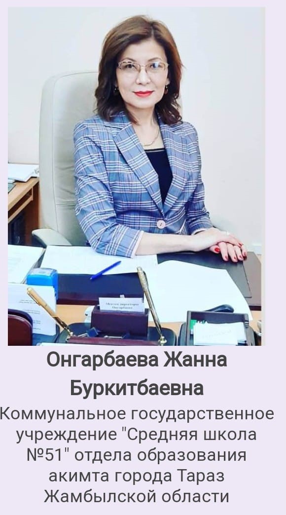 Оңғарбаева Жанна Бүркітбаевна – Тараз қаласындағы №51 орта мектептің директоры.