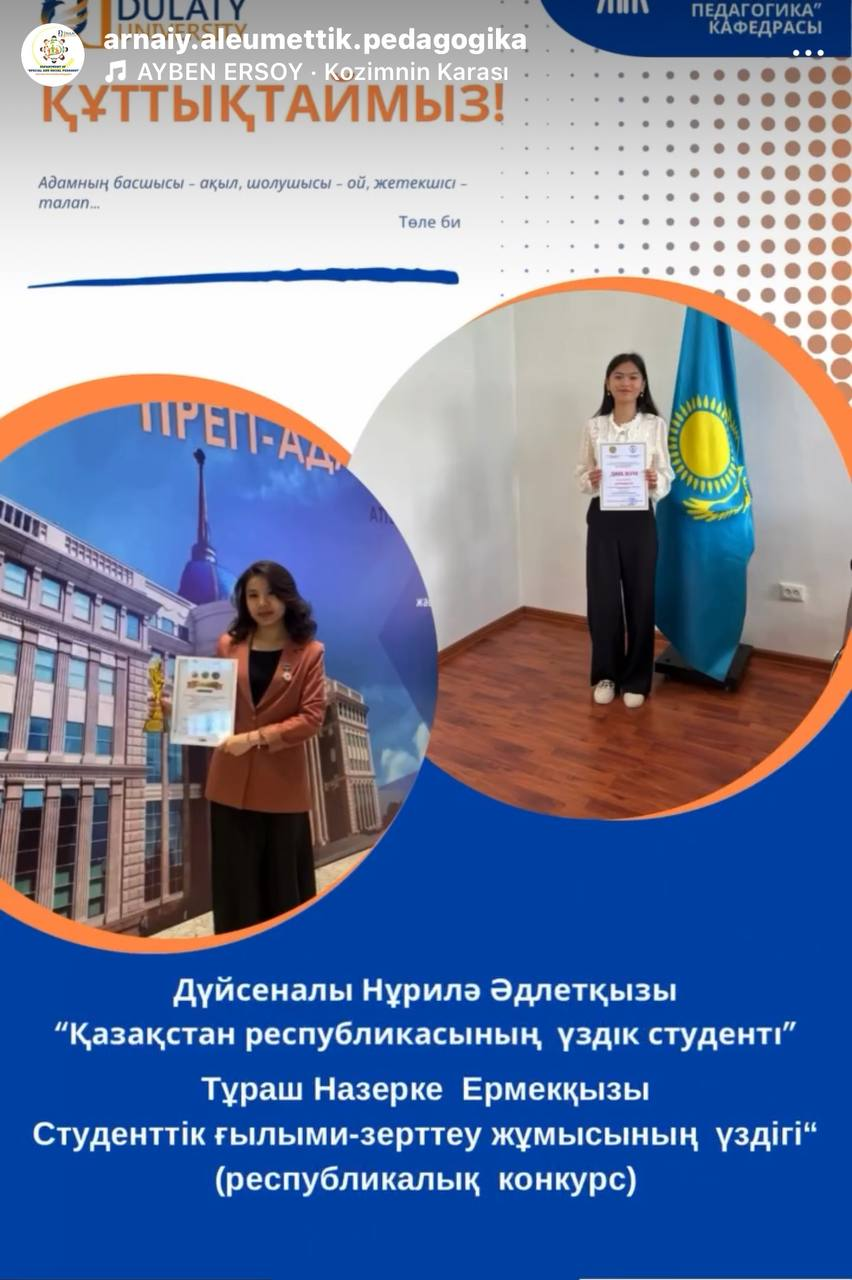 «Арнайы және әлеуметтік педагогика» кафедрасының студенттерін білім жолындағы жеңістерімен құттықтаймыз! Талаптарыңызға нұр жаусын! Білім мен ғылым белестерін бағындыра беріңіздер! Дүйсеналы Нұрилә Әдлетқызы «Қазақстан республикасының үздік студенті». Тұраш Назерке Ермекқызы «Студенттік ғылыми-зерттеу жұмысының үздігі» республикалық конкурс жеңімпазы.