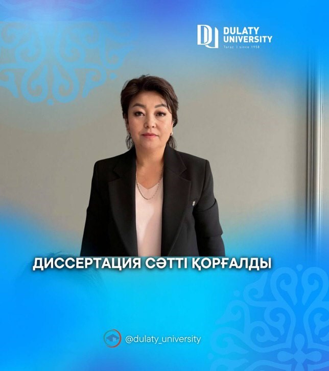 М.Х. Дулати атындағы Тараз университеті, “Педагогика және әлеуметтік ғылымдар” факультетінің “Әлеуметтік психология” кафедрасының аға оқытушысы Алпысбай Ләйла Алпысбайқызы Абай атындағы Қазақ ұлттық педагогикалық университетінде философия докторы (PhD) дәрежесін алу үшін “8D01101 – Педагогика және психология” білім беру бағдарламасы бойынша “Мектептің білім беру ортасын өлшеу мен бағалауда болашақ педагог-психологтардың құзыреттіліктерін дамыту” тақырыбындағы диссертациясын сәтті қорғады!
