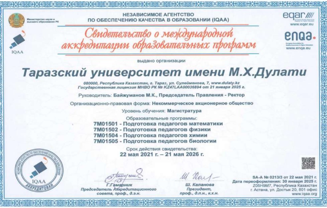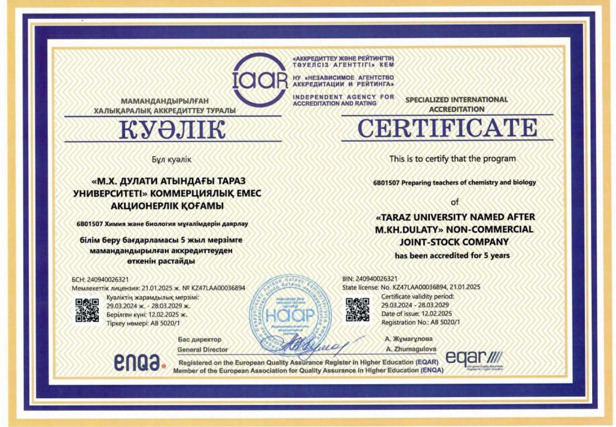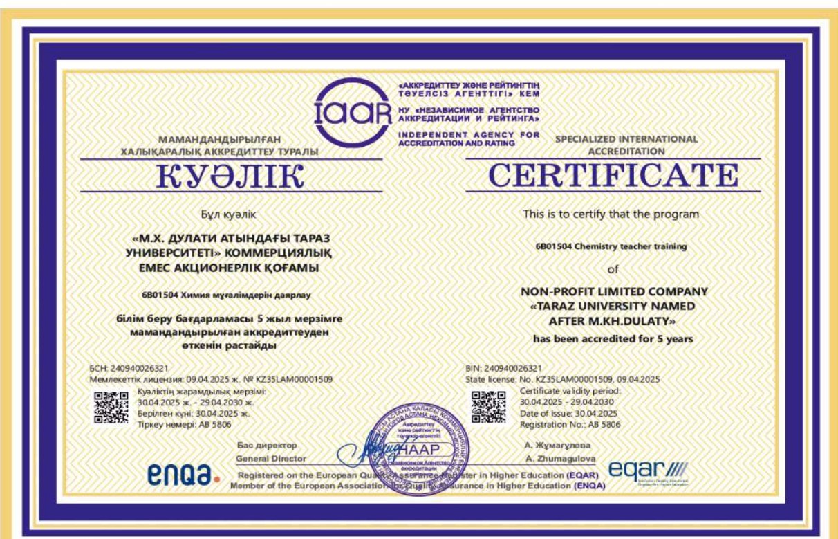 Кафедра «Химия» — это динамично развивающееся учебно-воспитательное структурное подразделение Университета Дулати, играющая ключевую роль в подготовке высококвалифицированных педагогов в области химии и биологии. Деятельность кафедры направлена на предоставление нашим обучающимся не только глубокие теоретические знания, но и практические навыки, которые помогут им успешно работать в современных условиях.