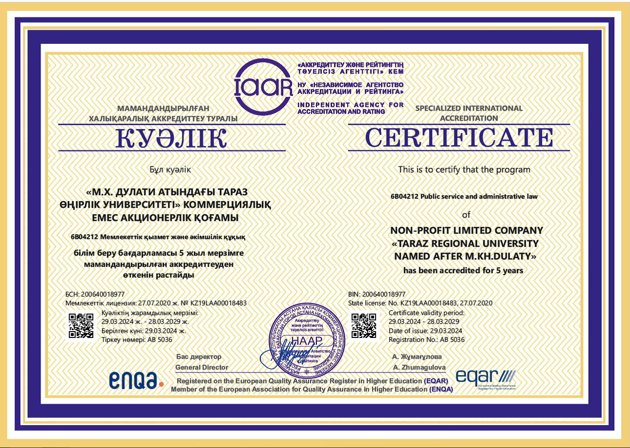 Кафедра "Государственное и административное право" готовит высококвалифицированных специалистов - юристов в области государственной службы по образовательной программе 6В04212-«Государственная служба и административное право» по направлению 6В042 – «Право».
