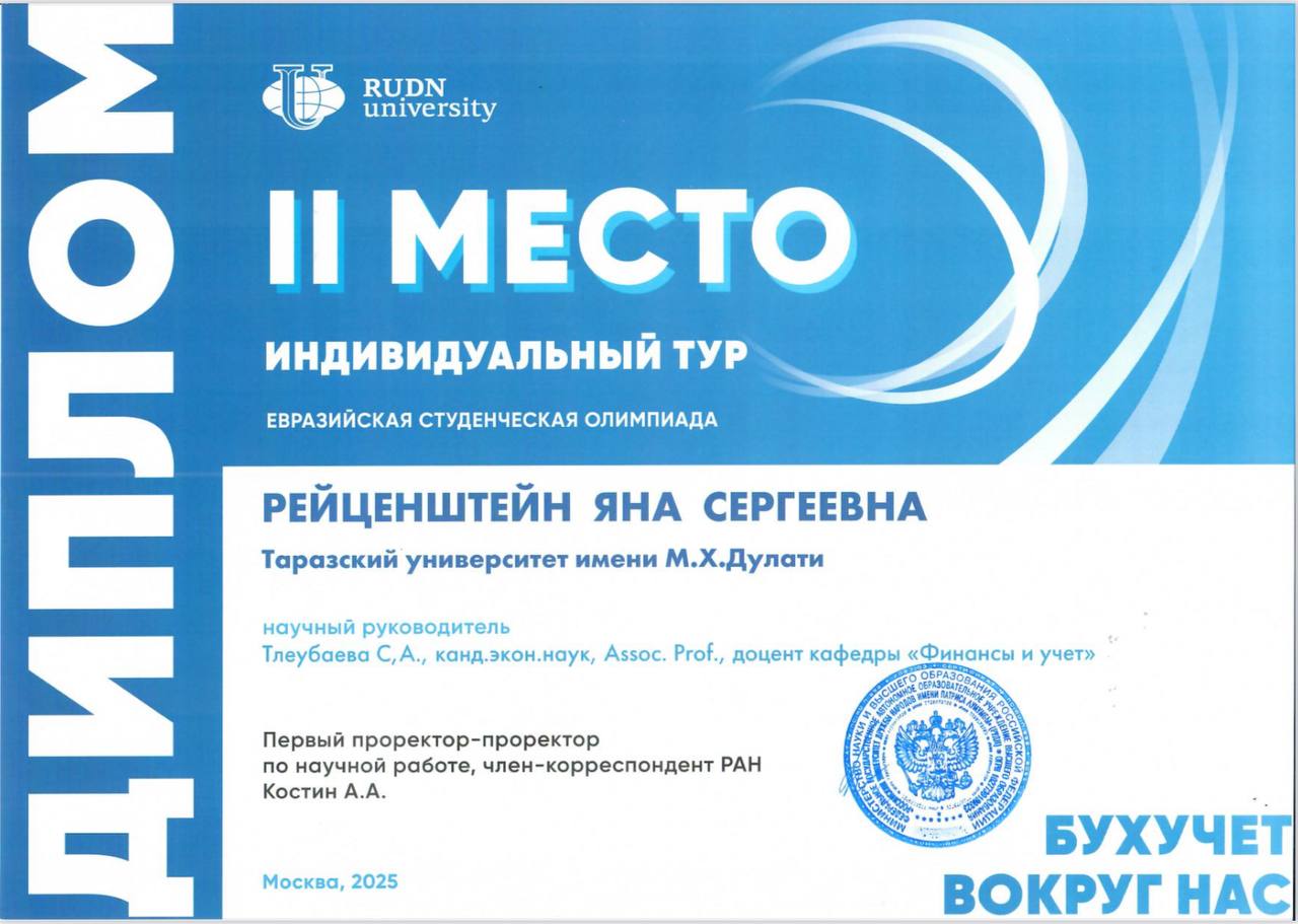 Айта кетерлігі, университетіміздің студенті Яна Рейценштейн жеке есеп нәтижесі бойынша жүлделі ІІ орынды иеленіп, Тараз университетінің абыройын асқақтатты. Барлық қатысушыларға сертификаттар табысталып, ғылыми жетекшілер арнайы алғыс хаттарға ие болды.